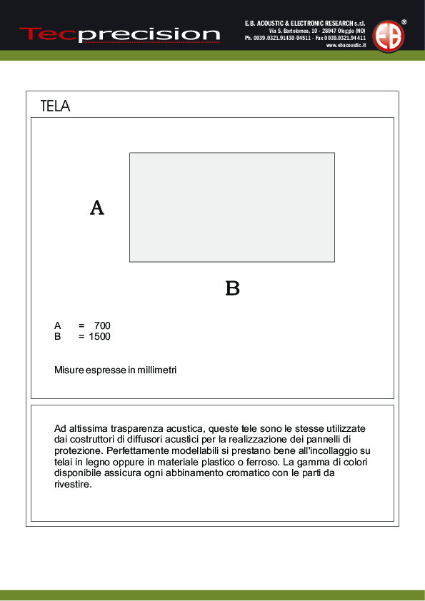 Ad altissima trasparenza acustica, queste tele sono le stesse utilizzate dai costruttori di diffusori acustici per la realizzazione dei pannelli di protezione. Perfettamente modellabili si prestano bene all’incollaggio su telai in legno oppure in materiale plastico o ferroso. La gamma di colori disponibile assicura ogni abbinamento cromatico con le parti da rivestire.