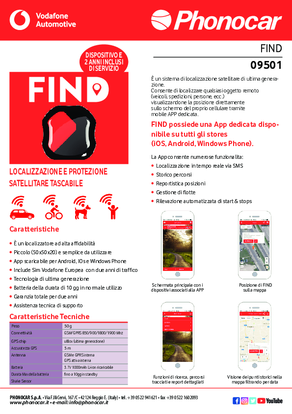 FIND è un sistema di localizzazione satellitare di ultima generazione che consente di localizzare qualsiasi oggetto remoto (veicoli, spedizioni, persone, ecc) visualizzandone la posizione direttamente sullo schermo del proprio cellulare tramite mobile APP dedicata. Find possiede una App dedicata disponibile su tutti gli stores (iOS, Android, Windows Phone) e consente numerose funzionalità: