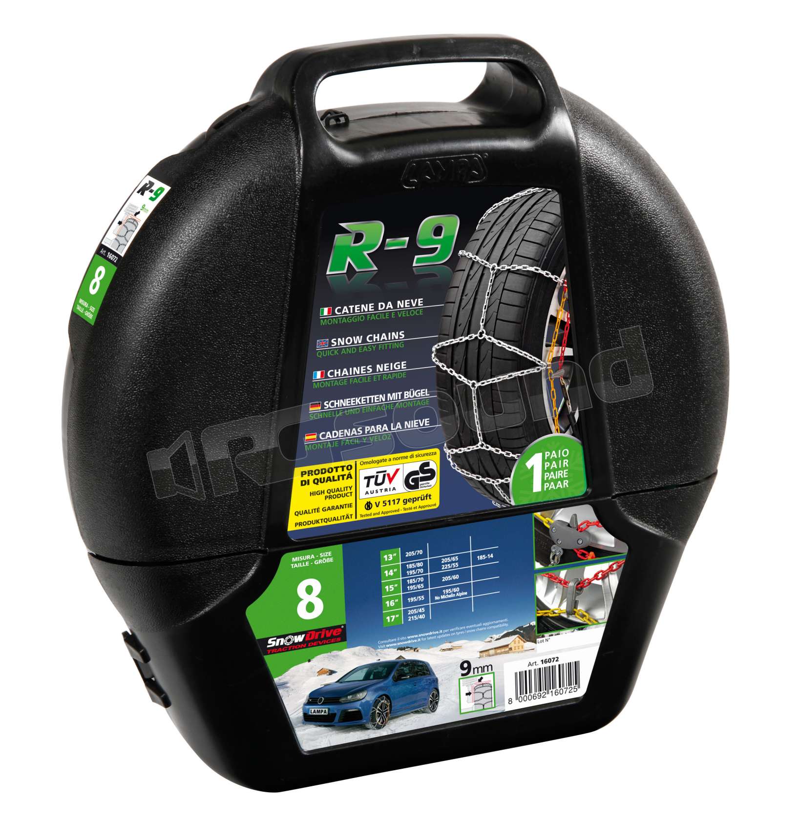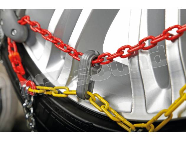 Catene da neve costruite a regola d’arte e certificate, in ottemperanza al decreto 10 Maggio 2011, (Ministero delle infrastrutture e dei Trasporti, Gazzetta Ufficiale N. 185 del 10 Agosto 2011). Dispositivo di aderenza supplementare omologato secondo le norme ÖNORM V5117 / V5119.