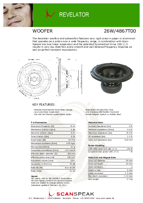 I woofer e i subwoofer della Serie Revelator presentano coni molto rigidi in carta o in alluminio che funzionano come pistoni su una vasta gamma di frequenze, in combinazione con la sospensione lineare a bassa perdita e l'azionamento simmetrico brevettato da Scan Speak (SD-1), ne risulta una distorsione e una risposta in frequenza regolare e ben comportata, nonché una perfetta riproduzione transitoria.