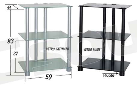 Mobile robustissimo (gambe in legno 60cm), elegante con 3 ripiani in vetro (8mm), con ruote piroettanti.