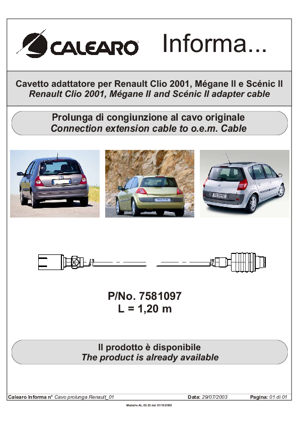Cavo prolunga AM/FM per sostituzione antenna originale Renault.