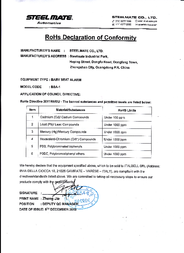 L'avvisatore bimbo a bordo STEELMATE BABYBELL BSA1 è un dispositivo wireless composto da un display acustico e visivo e di un pad di rilevamento da inserire sotto il cuscino del seggiolino. BSA-01 è un sistema di avviso bimbo a bordo che ricorda ai genitori distratti o sotto stress di portare il bambino fuori dalla macchina. Il sistema avviserà immediatamente un conducente che ha un bambino nel seggiolino quando l'accensione è disattivata.