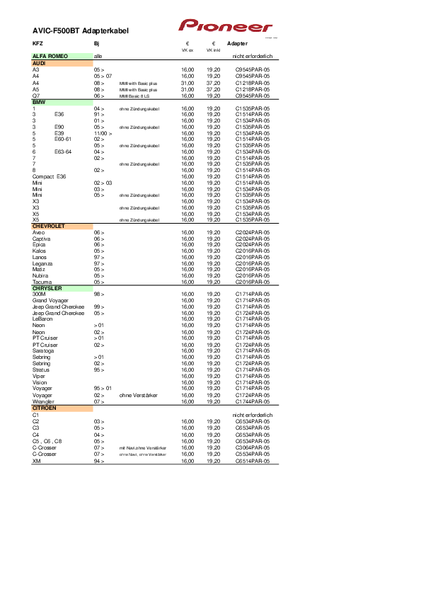 Pioneer C1218PAR-05 Cavo di collegamento per AVIC F500BT su Audi A4 dal 2008 e A5 dal 2008
