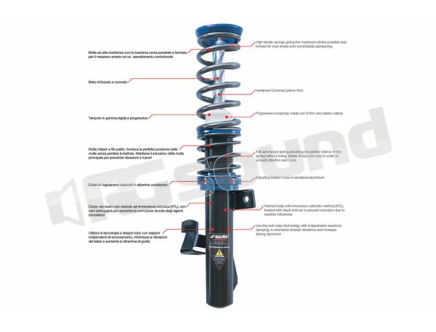 Ammortizzatori progettati per fornire significativi cambiamenti dell'altezza di marcia senza sacrificare il comfort di guida. Ideali per la pista ma idonei anche per uso stradale. Offrono variazioni di altezza a partire da 30 a 70 mm, donano un aspetto sportivo, migliorano la reattività, la maneggevolezza, l'aderenza in curva e il bilanciamento generale. Pronti per l'installazione, già tarati dalla fabbrica, testati per uso stradale e pista.