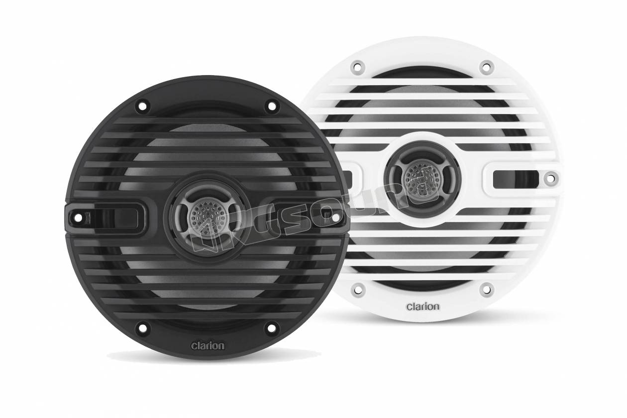 Clarion CMS-651-CWB coppia di altoparlanti coassiali 165mm, dotati di griglie classiche bianche e grigio scuro.
