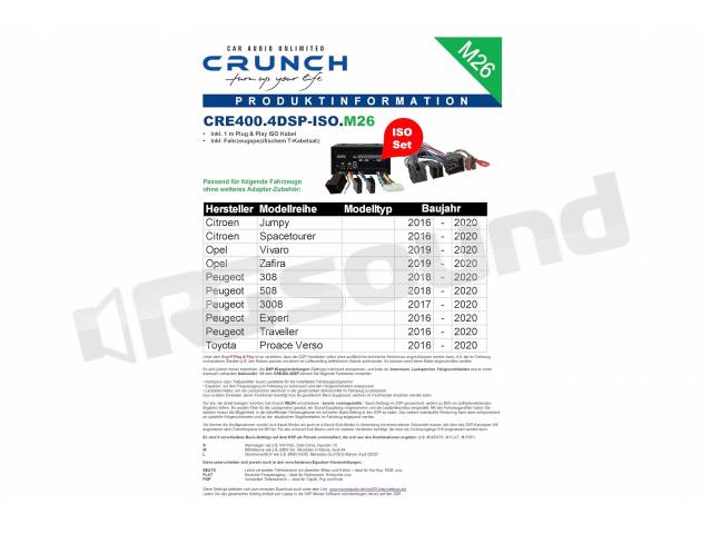 Streaming audio DP/aptX via BT | Dual Core DSP 32 bit / 122,88 MHz | funzione di accensione automatica |REM OUT |controllo DSP tramite app o PC |funzione bypass dell'amplificatore. CRE400.4DSP può essere utilizzato anche come DSP a 6 canali stand-alone.