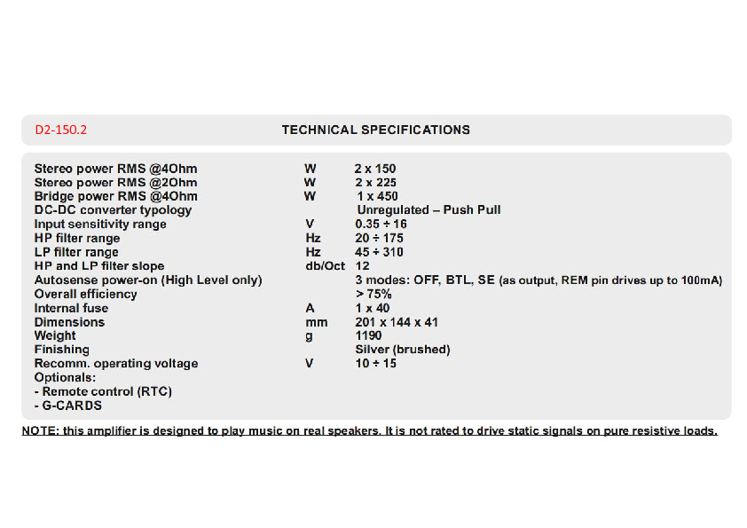 Potenza RMS: 2 x 150 Watt @ 4 Ohm < 1% THD+N