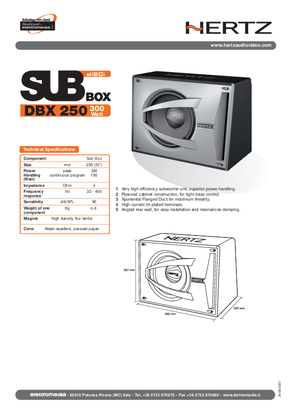Realizzato in solido truciolare di alto spessore, il DBX 250r offre una gamma bassa articolata, potente e veloce. L'esclusivo condotto di accordo Xponential Flanged Duct riduce al minimo le turbolenze del flusso d'aria, minimizzando le distorsioni, mentre la sezione tronco piramidale abbatte le risonanze interne e semplifica l'installazione in vettura.