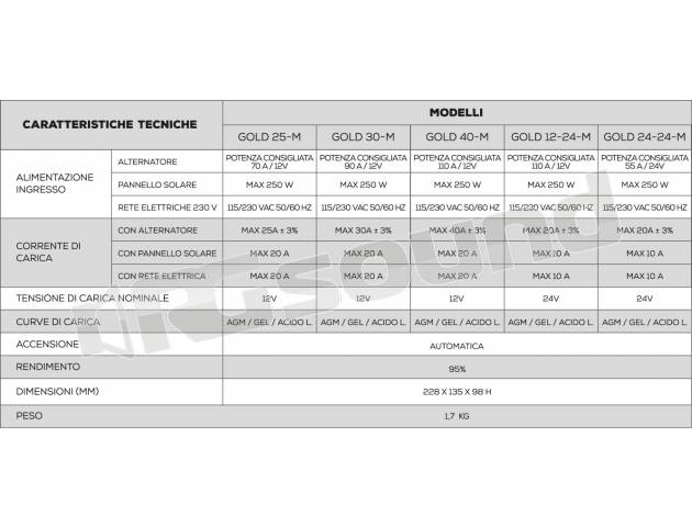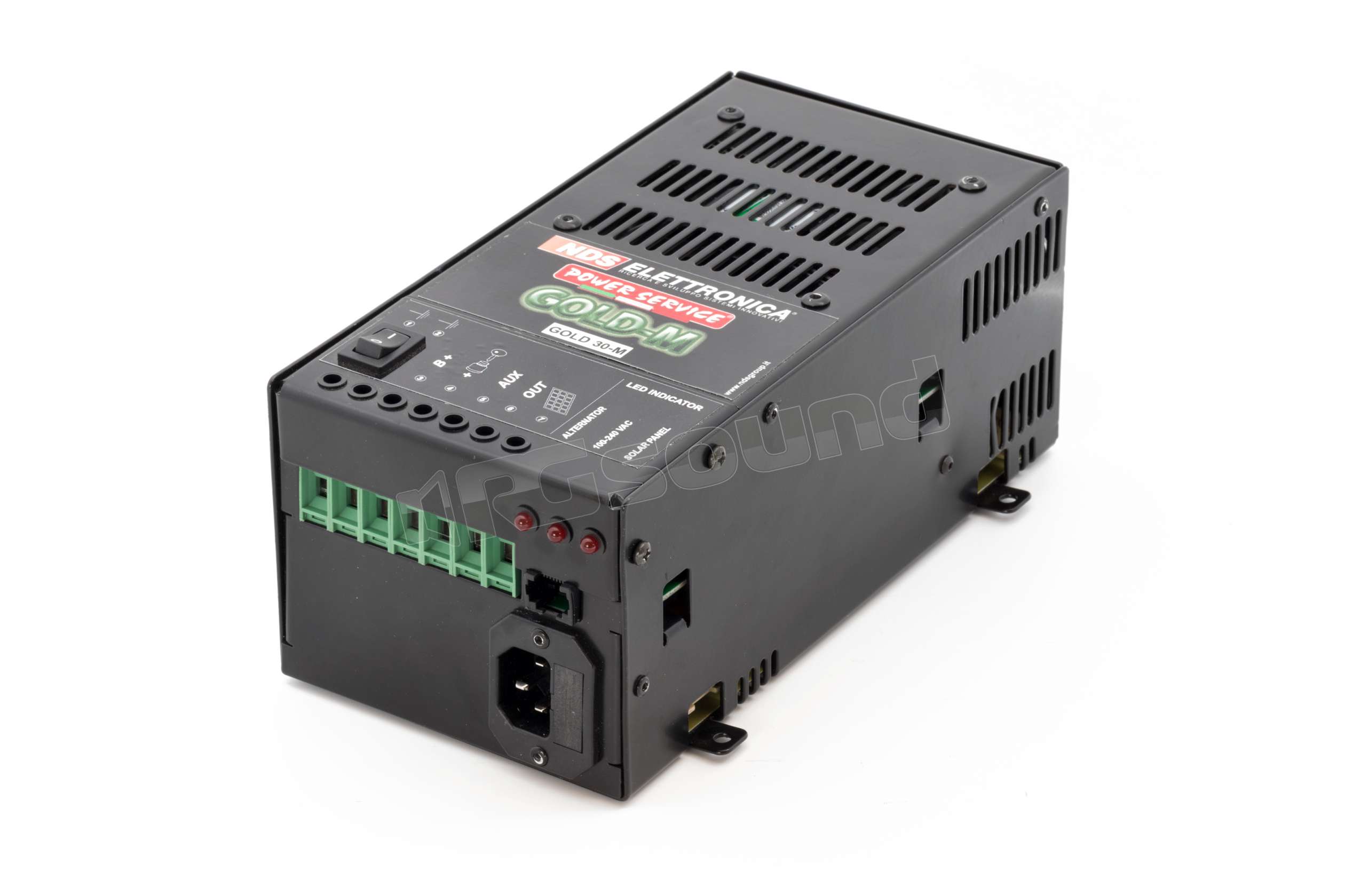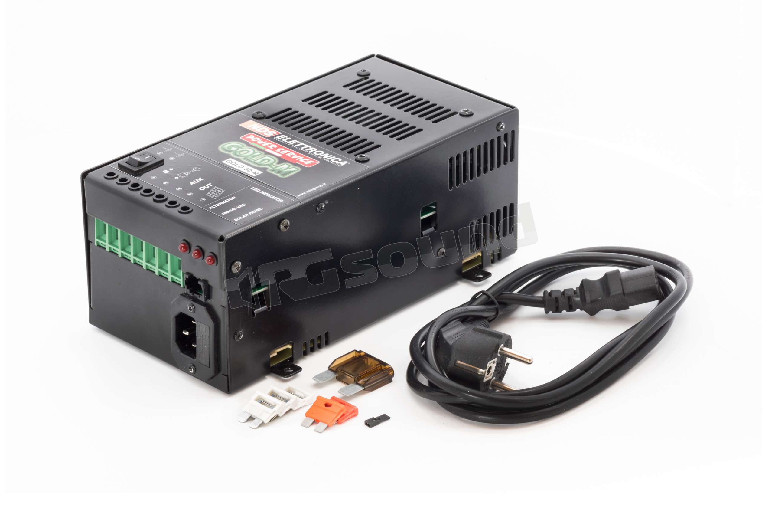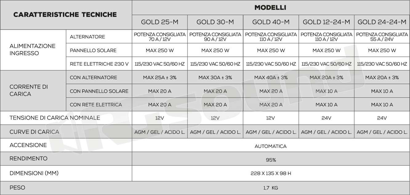 Il Power Service GOLD 30-M è uno speciale caricabatterie elettronico che, grazie ad un Brevetto della Nds Group, si alimenta da tre fonti diverse: alternatore, pannello solare e rete elettrica, effettuando una carica con curve studiate per batterie ad uso servizi di qualsiasi tecnologia ( GEL, AGM, ACIDO LIBERO). GOLD 30-M separa, ottimizza e ricarica le batterie motore e le batterie servizi.
