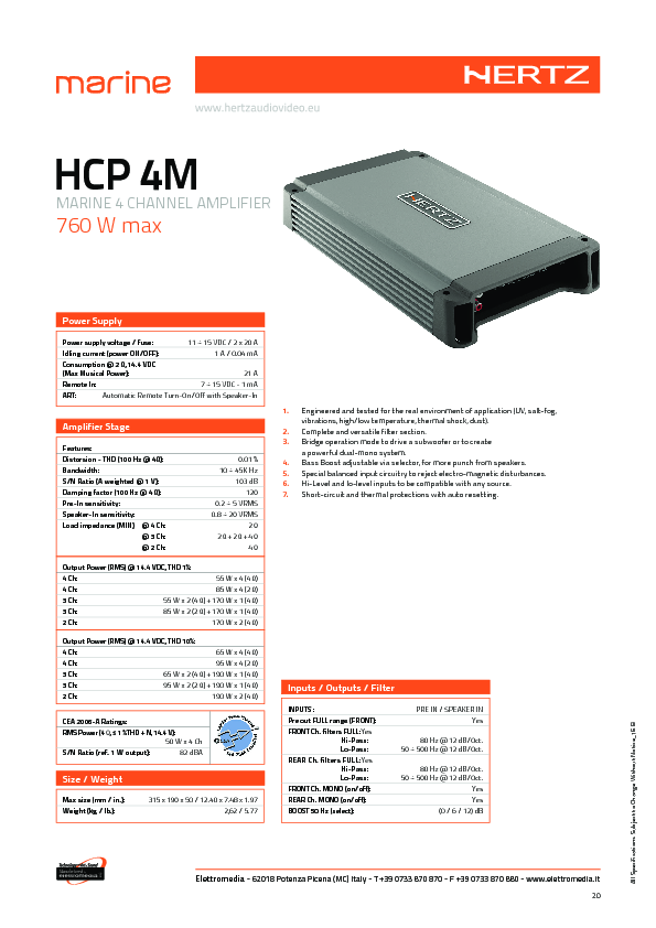 Dimensioni compatte,il design dell' HCP 4M è realizzato anche per la migliore dissipazione del calore attraverso delle speciali "ali" lungo i lati dell'amplificatore. Ingressi Pre e ingressi altoparlanti con circuito di bilanciamento per garantire un'alta protezione da interferenze elettromagnetiche così da ottenere come risultato un suono pulito senza rumore. Crossover integrato con filtro passa-basso e passa-alto regolabili 12 dB / ott. e 24 dB / ott. Inoltre l'HCP 4M ha la funzione Bass Boost che va a migliorare anche le basse frequenze e un filtro dall'estesa gamma in frequenza che può essere utilizzato durante la progettazione di sistemi con altoparlanti a 2 vie attivi.