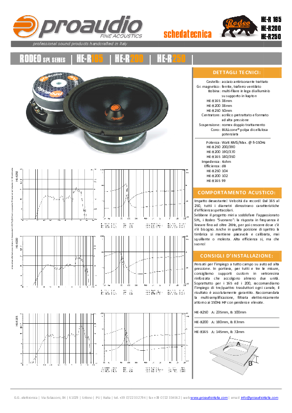 Pensati per l'impiego a tutto campo su ad alta pressione. In portiera, per tutte e tre le misure, consigliamo supporti custom in vetroresina rinforzata che accolgono almeno due unità. Soprattutto per i 165 ed i 200, raccomandiamo l'impiego di tre/quattro trasduttori ogni canale, il risultato è assolutamente garantito. Raccomandata la multi-amplificazione, filtrata elettronicamente attorno ai 150 Hz HP con Pendenze elevate.