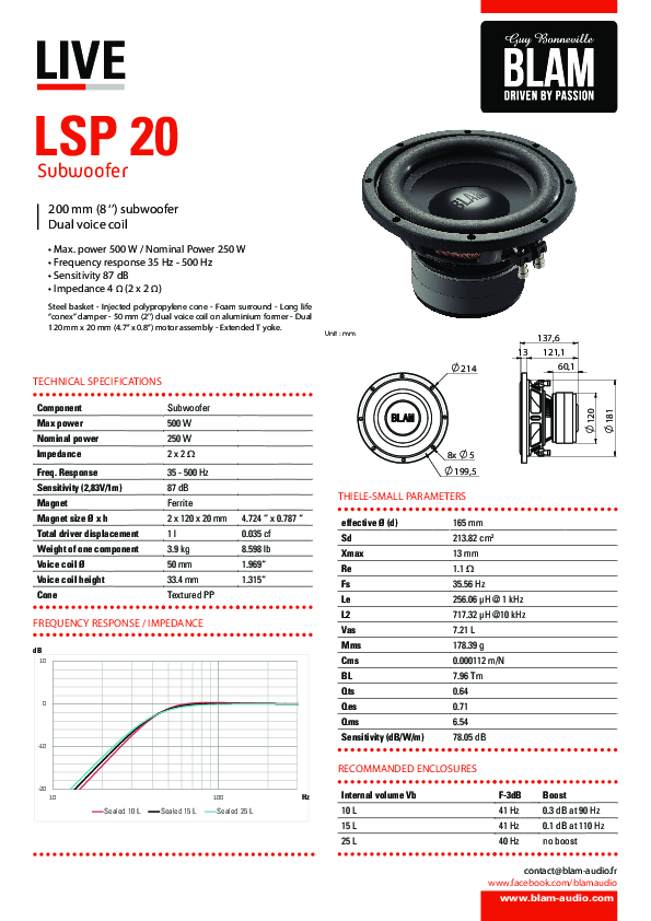 BLAM LS P20 subwoofer 20cm (8") con doppia bobina 2 Ohm, è il complemento ideale dei sistemi Blam della serie LIVE ed è stato progettato per esaudire la crescente richiesta di Subwoofer potenti ma di piccole dimensioni. LS P20 ha un diametro di soli 200 mm per 250 Watt di potenza continua dissipabile e volumi di lavoro compresi tra i 10 ed i 25 litri.