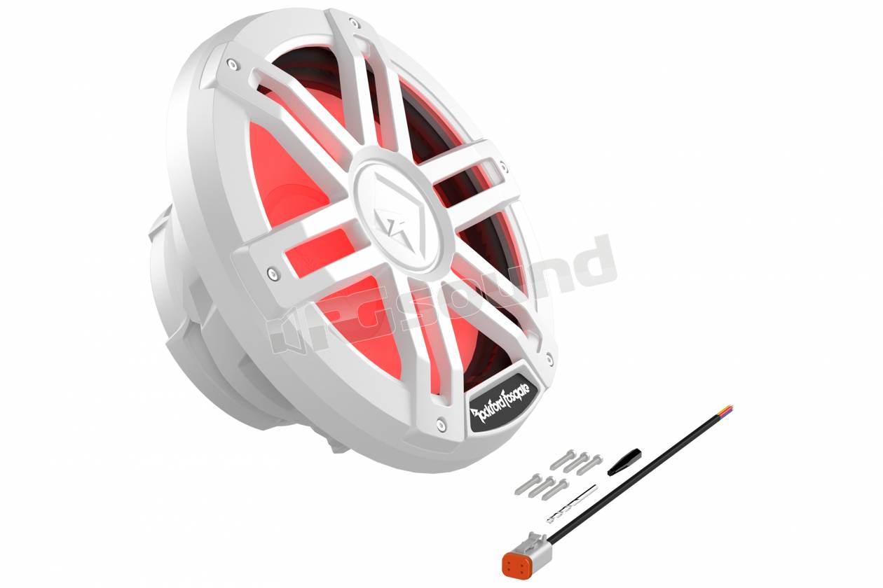 Rockford Fosgate M1D2-12 subwoofer nautico 30cm, con doppia bobina 2 Ohm, illuminazione LED personalizzabile, griglia sportiva bianca.
