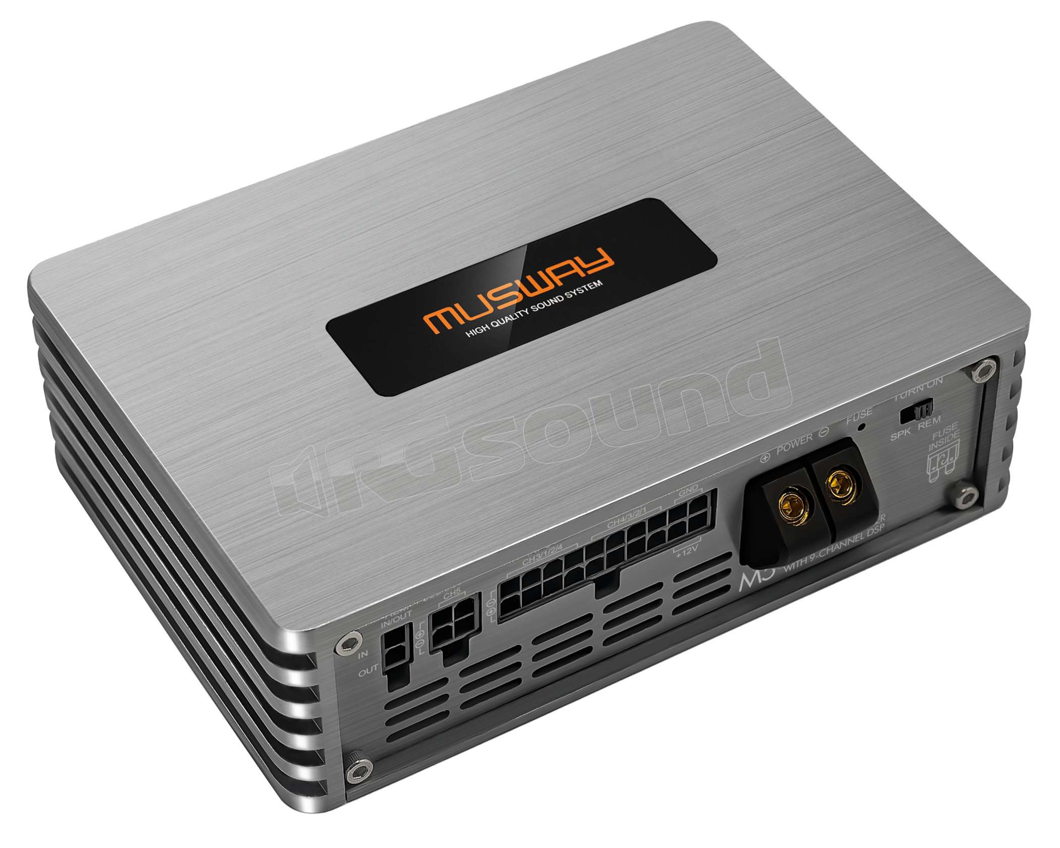 Il fulcro è il chip DSP all'avanguardia ADAU1452 di Analog Devices, che è stato messo a punto dagli ingegneri Musway e non lascia alcun desiderio audiofilo insoddisfatto. L’amplificatore è collegato tramite un cablaggio poco ingombranti con prese ISO, inoltre sono disponibili i set di cavi Plug & Play specifici per varii veicoli. Utili funzionalità aggiuntive includono il “soft-clipping” per proteggere l’elettronica e gli altoparlanti in modalità 2 Ohm. Anche di nuova concezione è l’ingresso di alto livello con “Error Protection System” che impedisce danni nei funzioni e l’archiviazione dei messaggi di errore nella memoria del veicolo.