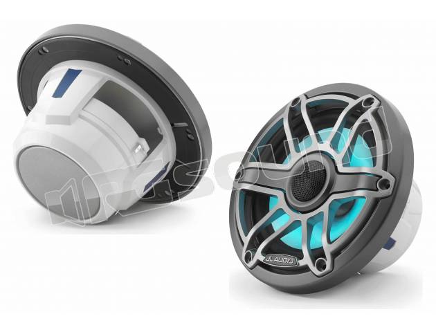 JL Audio M6-650X-S-GmTi-i coppia di altoparlanti coassiali nautici da 6,5 pollici (165 mm) con illuminazione a LED variabile, anello di regolazione e griglia sportiva con finitura titanio. Potenza nominale 75 W, impedenza 4 Ohm.