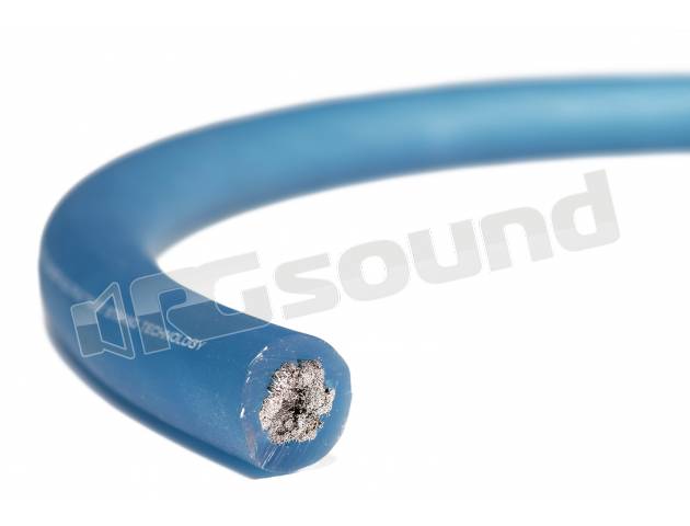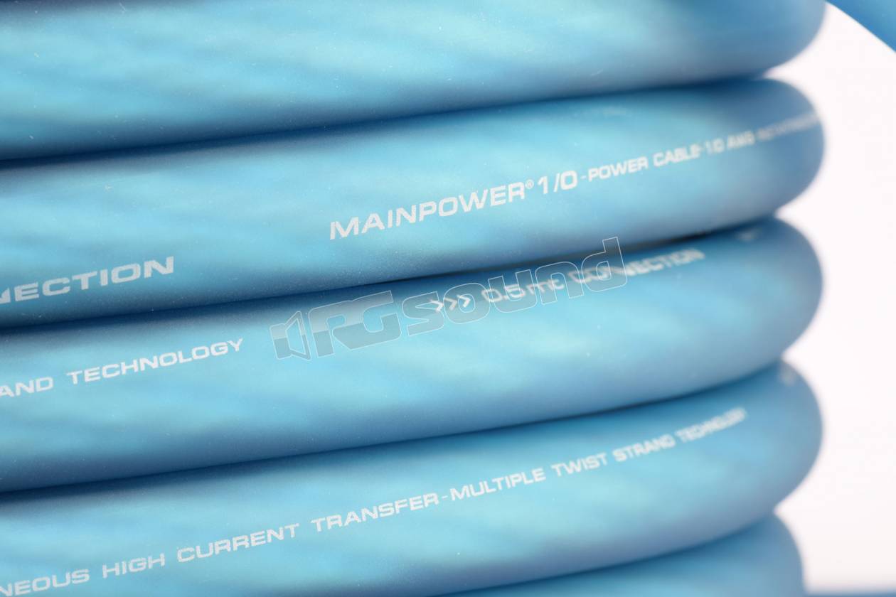 MP 1/0BL.2 cavo di alimentazione Mainpower da 1/0 AWG, per il trasferimento di alte correnti impulsive, colore della guaina in blu trasparente. L'elevata qualità della guaina e l'enorme numero di trefoli che compongono il cavo lo rendono incredibilmente morbido a tutto vantaggio della facilità di installazione.