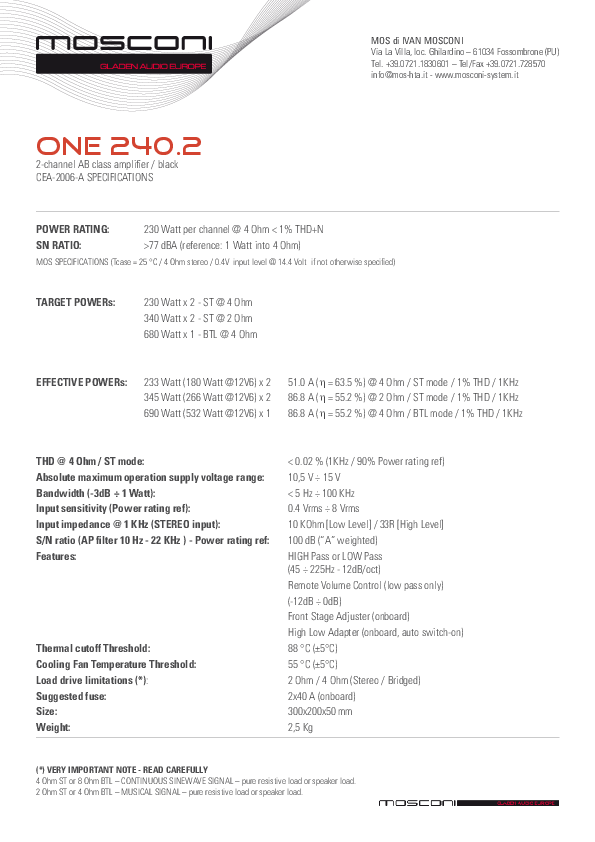 Mosconi ONE 240.2 amplificatore stereo a 2 canali ad alta potenza in classe AB. Le dimensioni estremamente compatte rendono l'installazione facile e pulita.