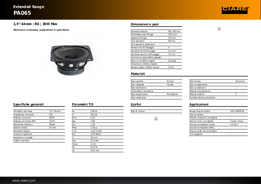 Ciare PA065 extended range 65 mm con membrana in cellulosa e sospensione in poliuretano, impedenza 8 Ohm, potenza 30 W