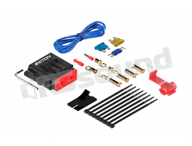 Kit di cavi di alimentazione di alta qualità, 10 mm² (AWG 7), con accessori coordinati per collegare facilmente un amplificatore o un subwoofer attivo o simili all'interno del veicolo.
