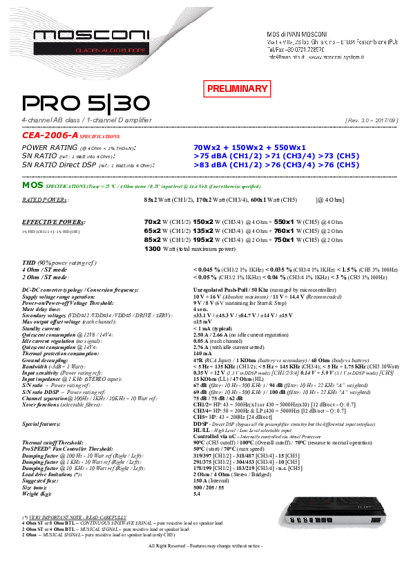 Dotato di cinque canali dalla potenza differenziata, in Classe AB e in Classe D. La massima flessibilità è garantita dalla presenza di crossover attivi separati in tutti i canali o, in alternativa, dalla possibilità di bypassare tutti i crossover per adattare i parametri d’ingresso per l’utilizzo con i DSP di Mosconi.