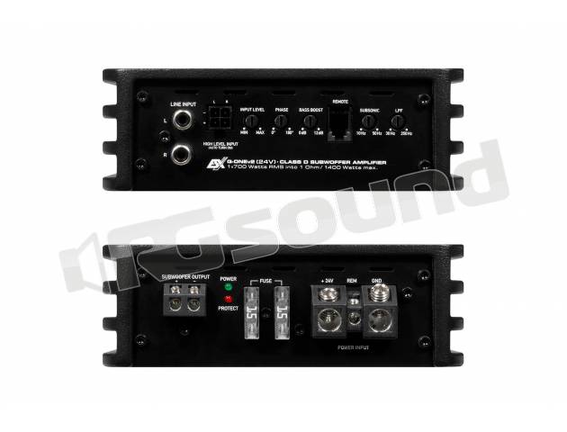 ESX Q-ONEv2 amplificatore digitale compatto a 4 canali in Classe D con ingresso di alto livello, protezione EPS (Error Protection System) e potenza massima 800 Watts. Funziona a 24 V.
