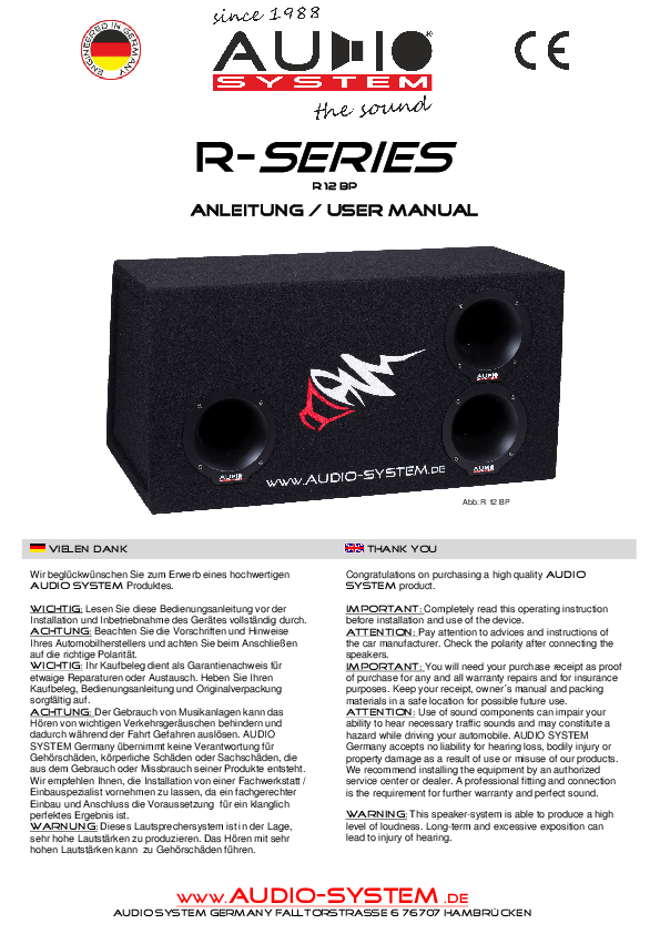 Audio System R 12 BP subwoofer 30cm in cassa passa banda da 75 litri realizzata in MDF altamente resistente, con pannello frontale spesso 20 mm Impedenza: 4 Ohm Potenza 400 / 600 Watt Dimensioni: (L) 760 mm - (A) 380 mm - (P) 330 / 470 mm