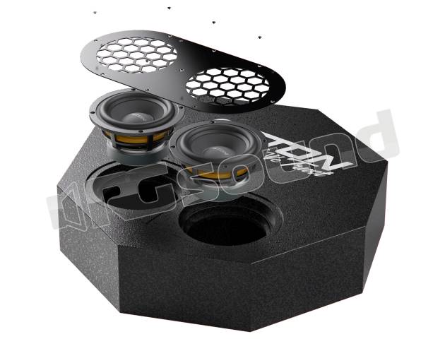 2 woofer a ampia escursione da 130 mm (2 x 5 pollici) con cono in carta pressata, cestello in alluminio pressofuso, potente magnete in ferrite, costruzione bass-reflex con finitura verniciata a martello, cabinet in legno MDF massiccio, griglia in alluminio resistente con modulo amplificatore AM300-2 300 W RMS @ 2 ohm, filtro passa-basso 40 - 100 Hz, funzione Auto-Sense On, capacità start-stop, 86 dB SPL, design compatto per vani per ruota di scorta poco profondi, 550 x 126 mm (PxH), ~ 12 kg.