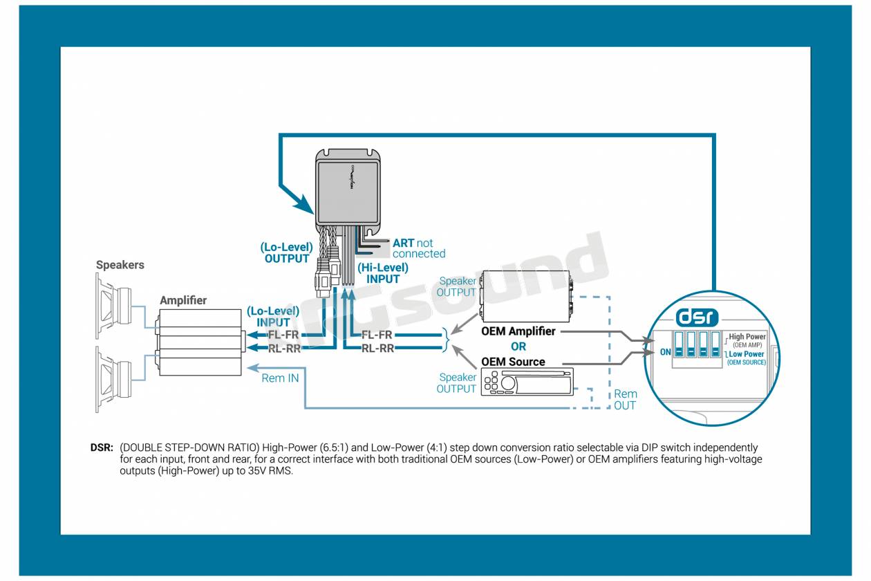 DSR (Doppio Rapporto Step-Down): rapporto di conversione step-down ad alta potenza (8:1) e a bassa potenza (4:1) selezionabile tramite interruttore DIP in modo indipendente per ciascun ingresso, anteriore e posteriore, per una corretta interfaccia con sorgenti OEM tradizionali (Low-Power) o amplificatori OEM con uscite ad alta tensione (High-Power) fino a 35 V RMS.