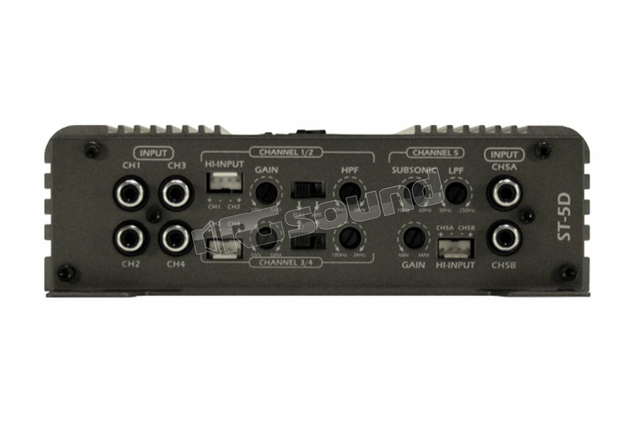 Zapco ST-5D amplificatore full-range 12V a 5 canali in Classe D, dimensioni compatte, ingresso di alto livello. Stabile a 4 e a 2 Ohm, potenza MOSFET 4 x 100 Watt RMS @ 4 Ohm.