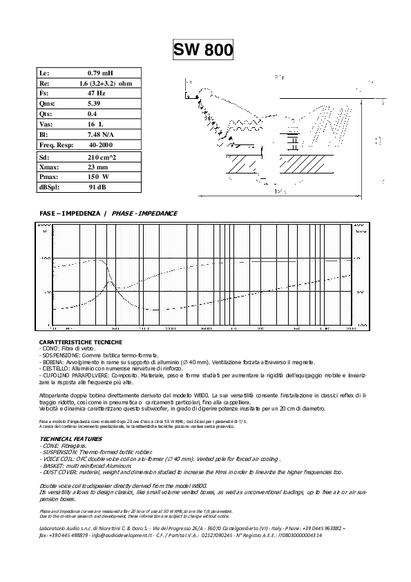 l SW800 di AD Audio Development è un subwoofer da 200 mm progettato per offrire prestazioni sonore di alto livello in applicazioni automobilistiche. Dotato di un cono in fibra di vetro e di una sospensione in gomma butilica termo-formata, questo subwoofer garantisce una riproduzione precisa delle basse frequenze. La presenza di due bobine da 3,2 Ohm consente una configurazione flessibile in parallelo o in serie, adattandosi a diverse esigenze di impedenza.