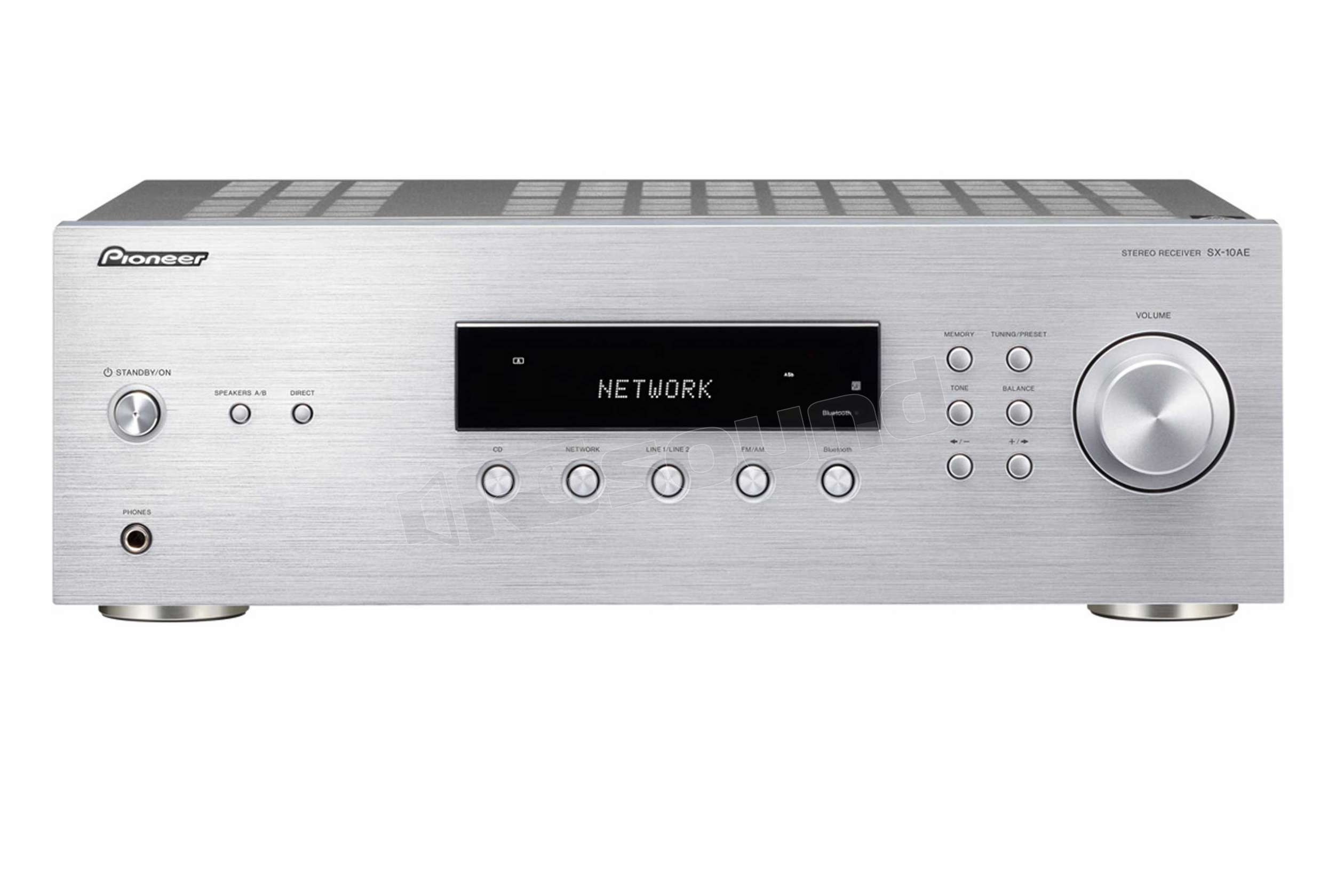 Pioneer SX-10AES ricevitore stereo Pure Audio dotato di Bluetooth, con 2 x finali da 100 Watt, 4 ingressi di linea, uscite audiocassetta e subwoofer, Speaker A/B e radio FM. Finitura argento.