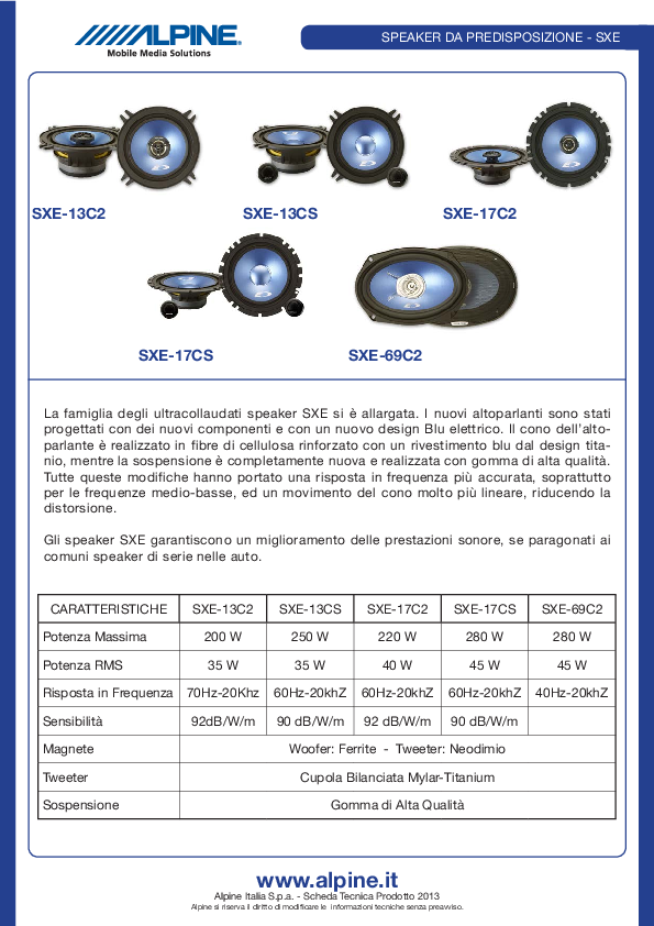 Gli ultracollaudati speaker SXE, sono stati aggiornati con alcuni nuovi componenti e con un nuovo design Blu elettrico. Il cono dell'altoparlante è realizzato in fibre di cellulosa rinforzato con un rivestimento blu dal design titanio, mentre la sospensione è completamente nuova e realizzata con gomma di alta qualità. Tutte queste modifiche hanno portato una risposta in frequenza più accurata, soprattutto per le frequenze medio-basse, ed un movimento del cono molto più lineare, riducendo la distorsione.