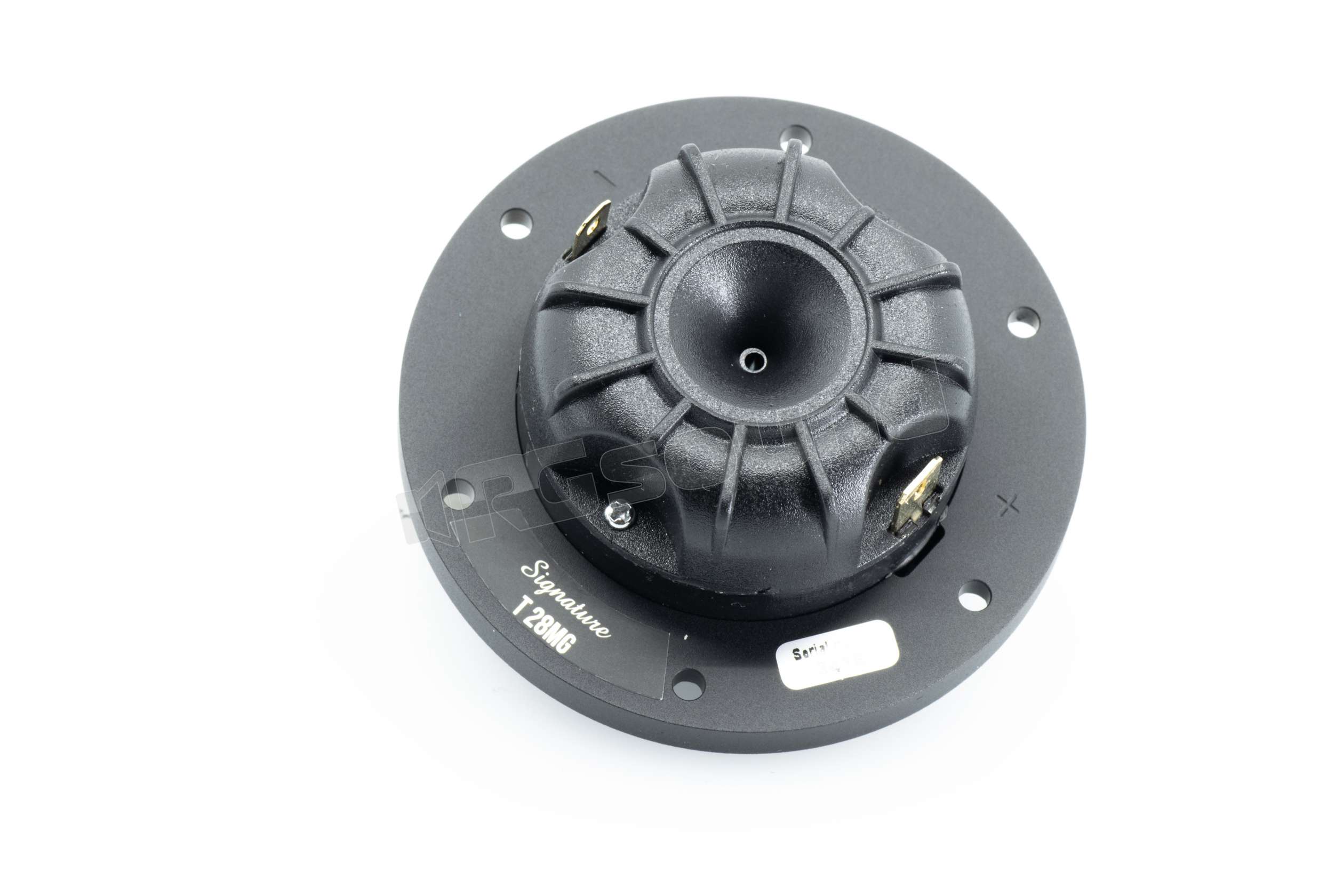 Il tweeter T28MG è dotato di una cupola in magnesio da 28 mm (1"), che fornisce una riproduzione degli acuti particolarmente precisa e dettagliata. Con una potenza massima di 80 W e una potenza nominale di 40 W, ha una risposta in frequenza estesa da 30 kHz a 1,5 kHz, garantendo una riproduzione ad alta frequenza molto trasparente.