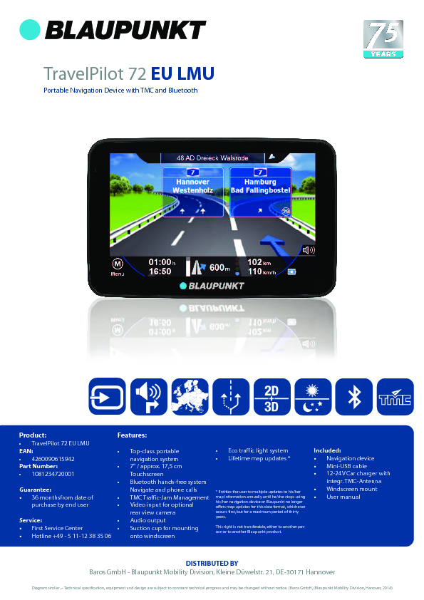 * Entitles the user to multiple updates to his/her map information annually until he/she stops using his/her navigation device or Blaupunkt no longer offers map updates for this data format, whichever occurs first, but for a maximum period of thirty years. This right is not transferable, either to another person or to another Blaupunkt product.