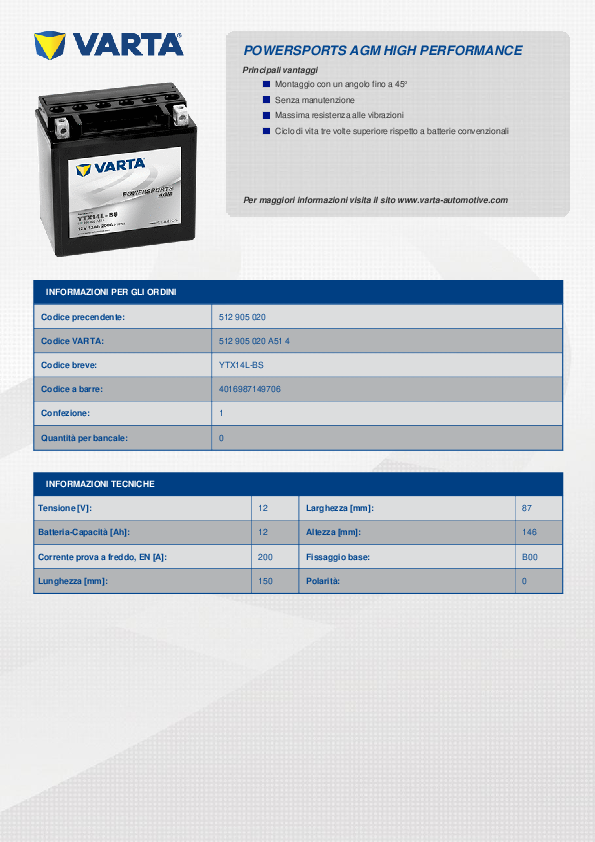 VARTA YTX14L-BS batteria Powersports AGM High Performance 512 905 020