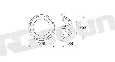 Subwoofer, diametro 390 mm, 500 watt nominali, 1000 watt max, cono concavo in polipropilene placcato color titanio, cestello in pressofusione di alluminio, sospensione in gomma butilica, piastre polari cromate, morsetti a vite.