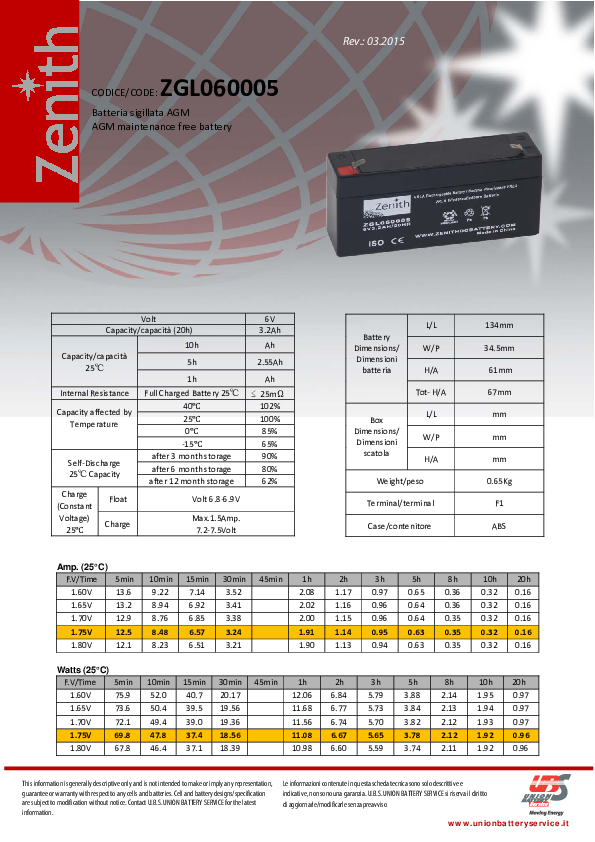 Nota: la batteria ZGL060005 non è idonea per impieghi ciclici, se utilizzata in applicazioni nautica/camper, dimensionare la sua capacità del pacco batterie in modo che la corrente di scarica non superi 0.2C/20h (es. max 20A di scarica su 100Ah/20h di batteria). Ciò consente di ottenere una ragionevole autonomia ed una vita della batteria più che accettabile.